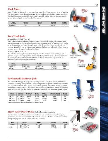 to perform a variety of repairs. Manually raised by hand pump lever. Removable handle and